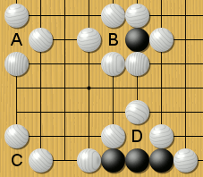 Si Noir joue à l'endroit cerné, il se tue lui même. Dans la situation B et D avec encore une pierre et respectivement 3 pierres en plus. Mai si on pose une pierre sur un telle intersection cerné et que l'on prenne, ce faisant au groupe ennemi sa dernière liberté, on tue ce groupe; dans ce cas il ne sagit donc pas d'un suicide, bien au contraire.
