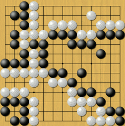 En jouant aux échecs ou aux dames, le damier se vide peu à peu. En jouant au Go, au contraire, le damier se remplit de plus en plus. Inévitablement les deux 'armées' se rapprochent toujours plus l'une de l'autre. On pourrait croire qu'en manoeuvrant ainsi, tous les groupes finiraientpar se menacer les luns les autres, mais ce n'est pas le cas. Il est en effet possible de construire un groupe de façon telle qu'il ne peut jamais être capturé. Le groupe noir par exemple en haut à gauche, est entièrement cerné à l'extérieur par des pierres blanches; néanmoins la situation, Noir ne court aucun danger. Blanc ne pourra jamais enlever les nombreuses libertés à l'intérieur. Toute pierre blanchequi serait posé derrière les lignes mourrait bientôt.