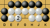 Blanc ici n'a qu'un seil oeil. Noir peut donc jouer sur une des deux intersection libres. si Blanc n'agit pas, Noir occupera au tour suivant l'autre intersection et capturera le groupe blanc. Et si Blanc capture la pierre noire, Noir revien à lintersection vide et capture le groupe blanc qui sera donc toujours perdu.